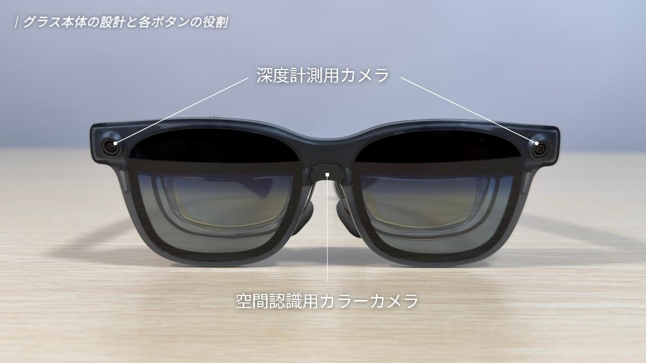 メガネの前面には、合計3つのカメラが搭載されています。中央は空間認識用のカラーカメラ、左右は深度計測用のカメラです。