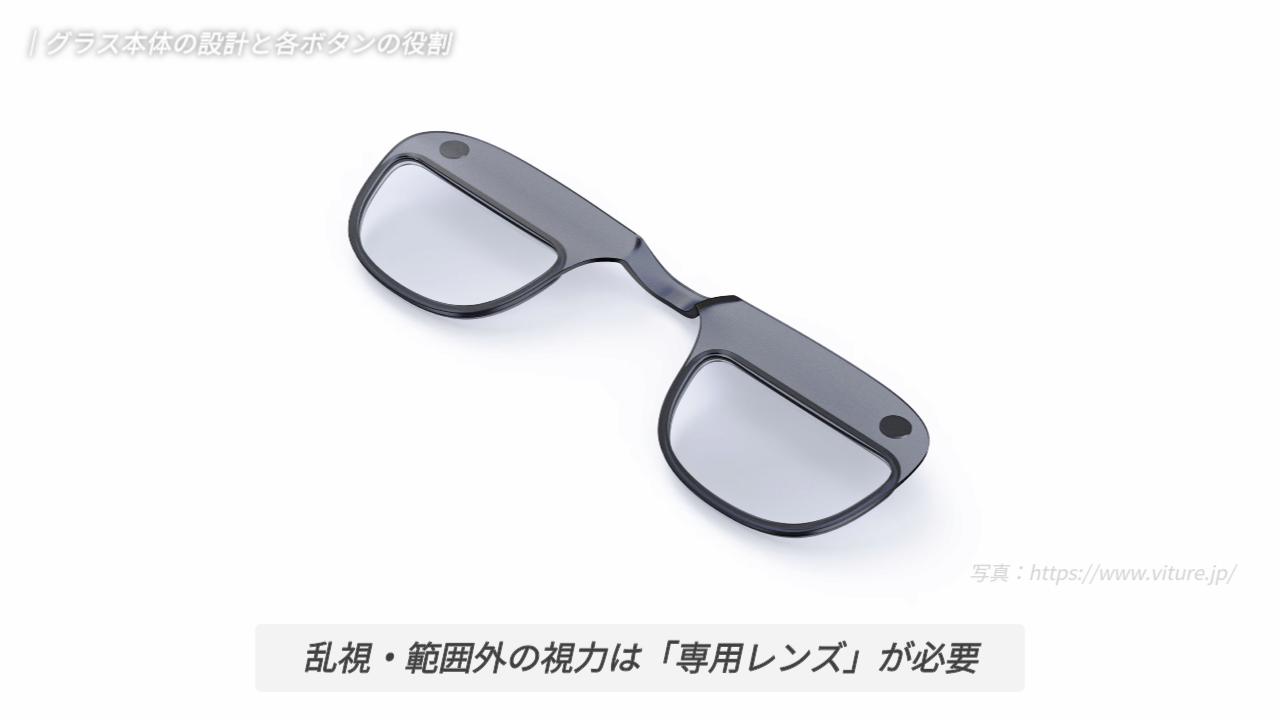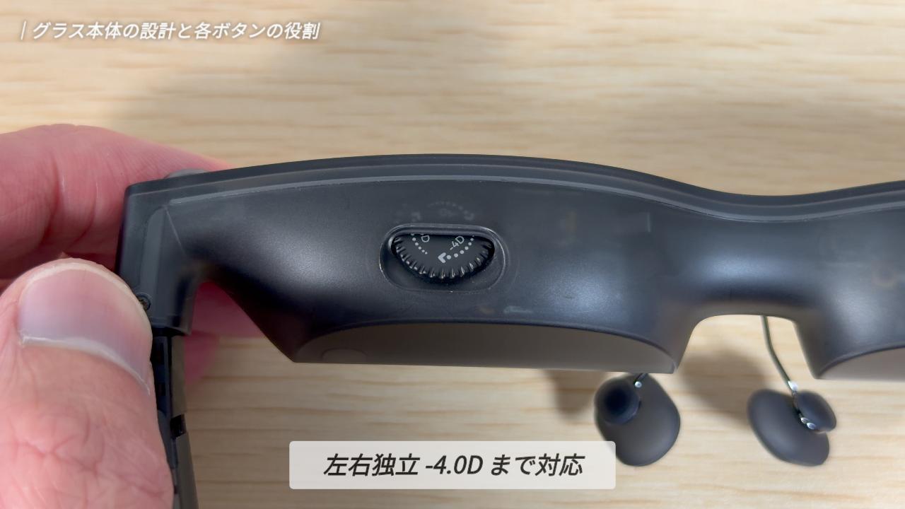 グラスの上部、左右に配置されているのは「視度調整ダイヤル」。このダイヤルを回すことで、左右個別に-4.0Dまでの近視調整が可能です。