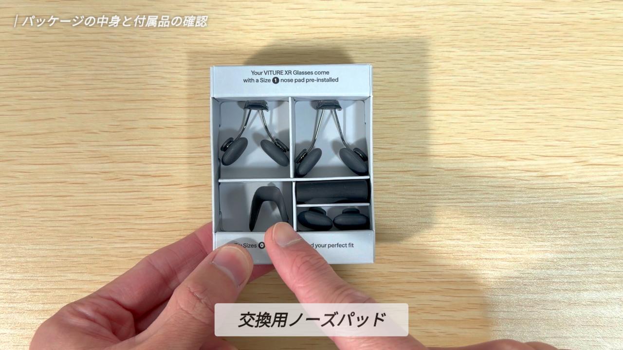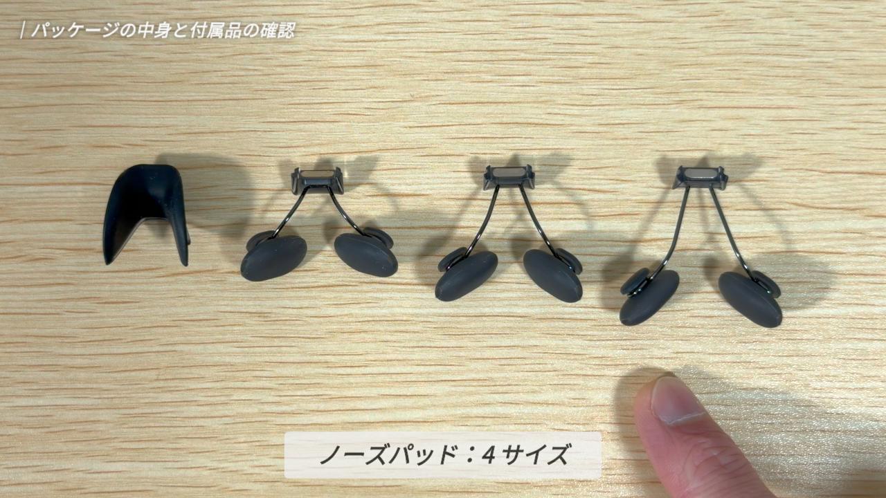 ノーズパッドは、グラスにはじめから装着されているものを含めて、4つのサイズが付属しています。