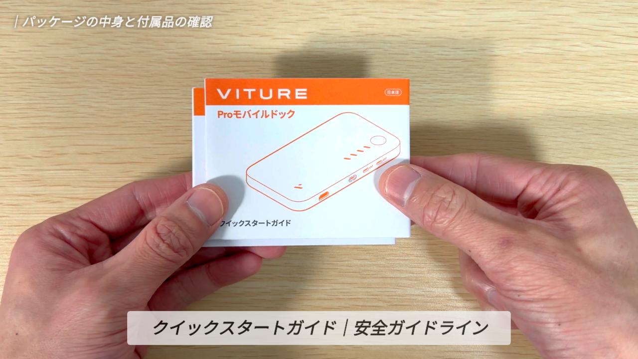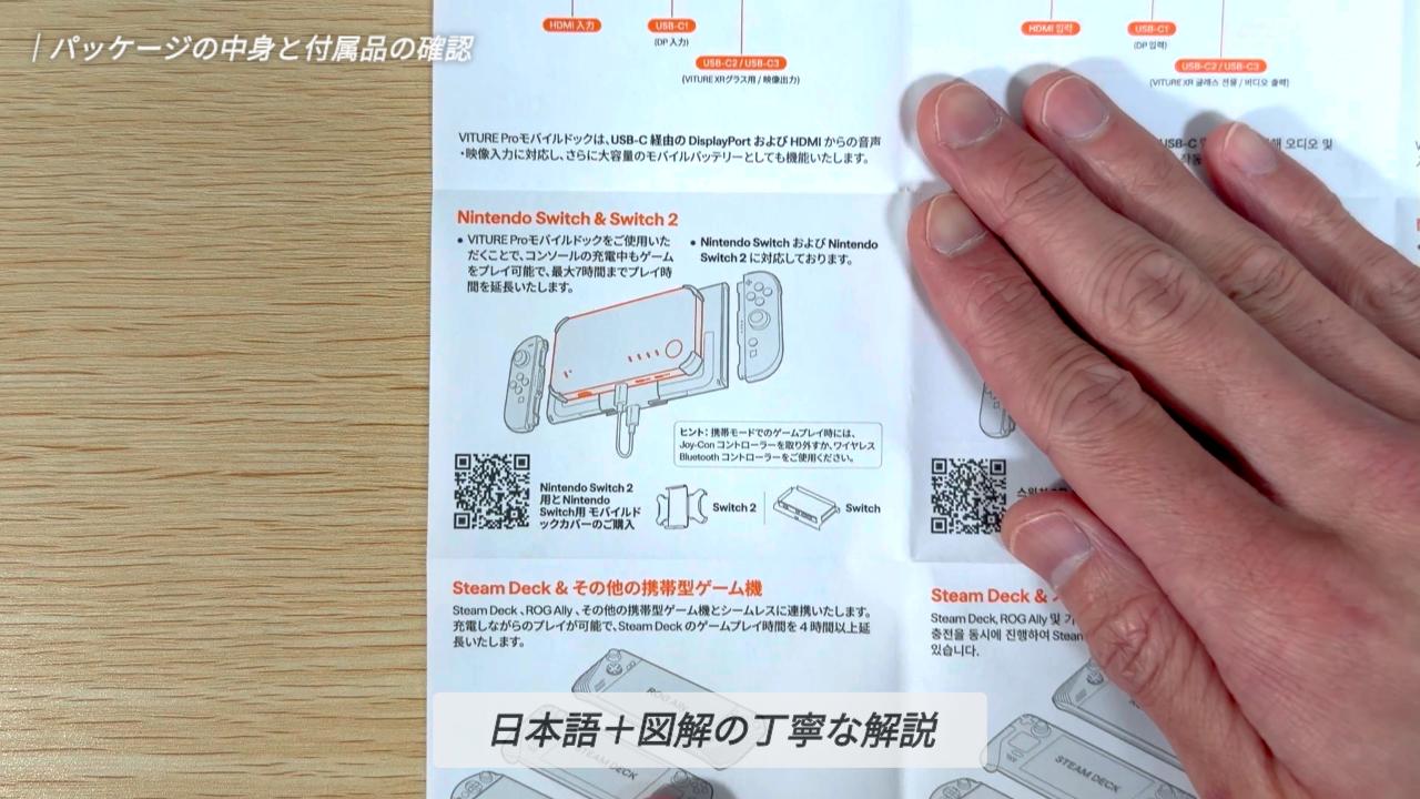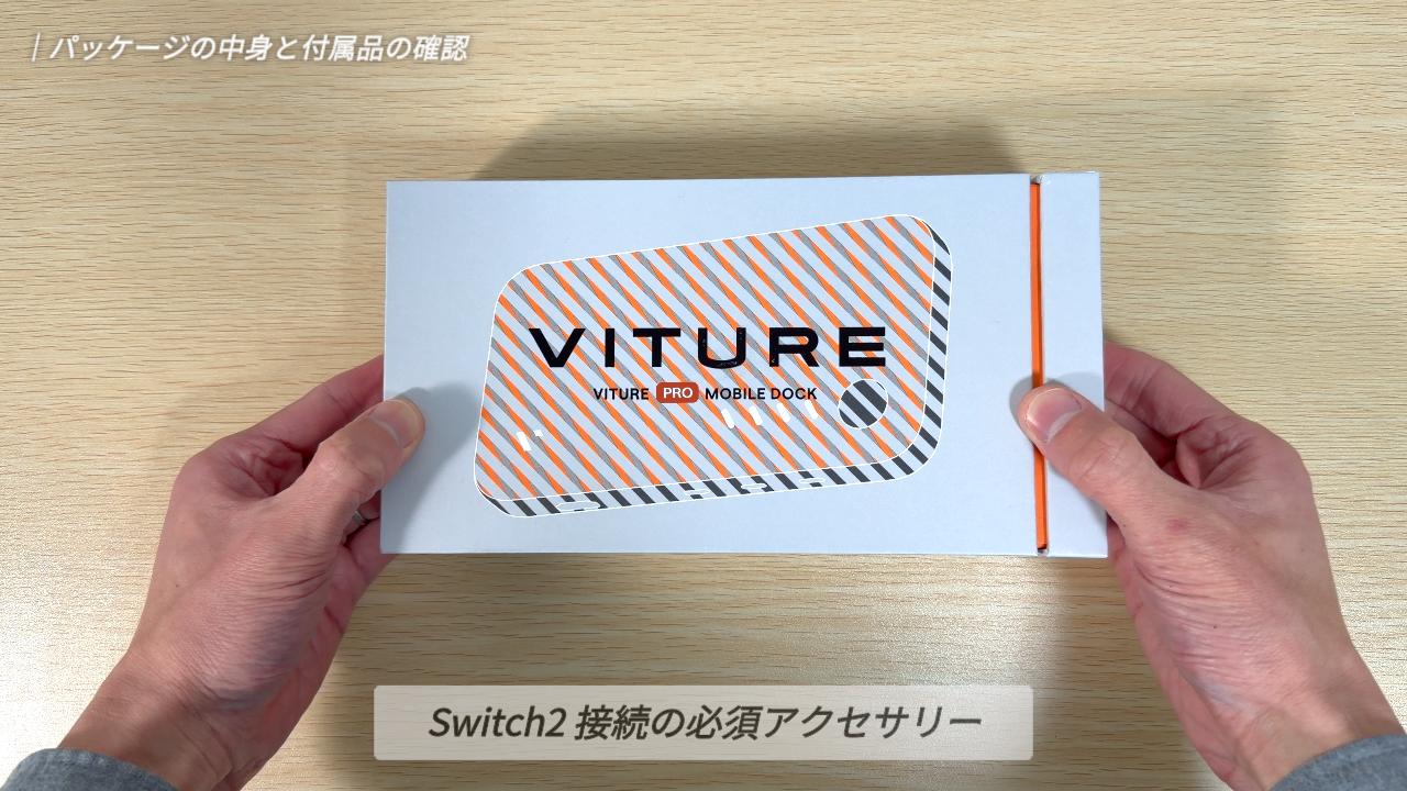 今回は、Switch2との接続に欠かせない別売りのアクセサリー「VITURE Pro モバイルドック」もあわせて提供していただきました。こちらの内容物も確認しておきましょう。