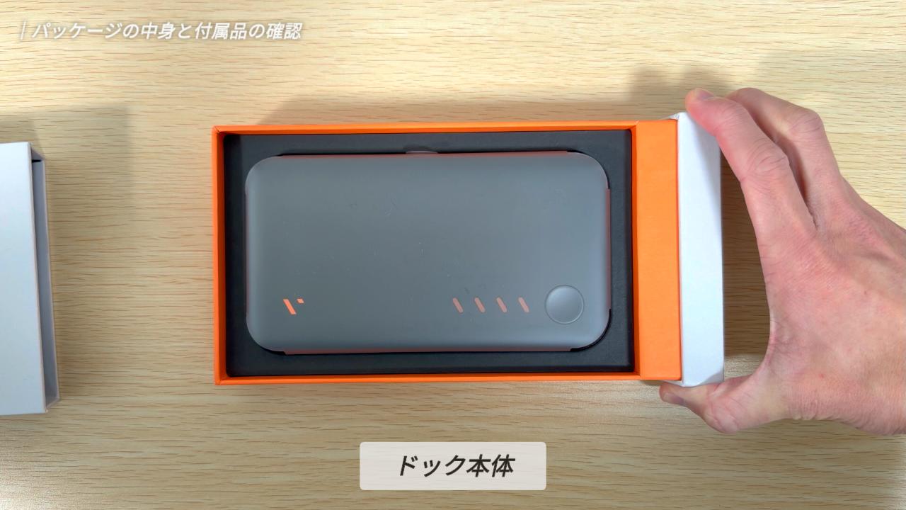 続いて、モバイルドックの電源を入れます。このドックは充電式ですので、事前に充電を済ませておく必要があります。バッテリーが切れると映像を出力できなくなりますので、その点は注意が必要です。