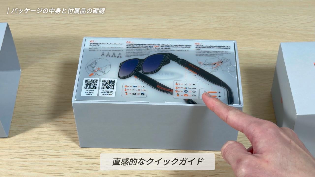開封すると、グラスの各ボタン機能がイラストで紹介された「クイックスタートガイド」が現れます。