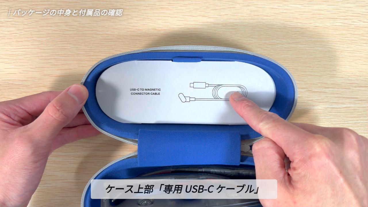 ケースの上部には、接続に使用する「専用のUSB TypeCケーブル」が格納されています。