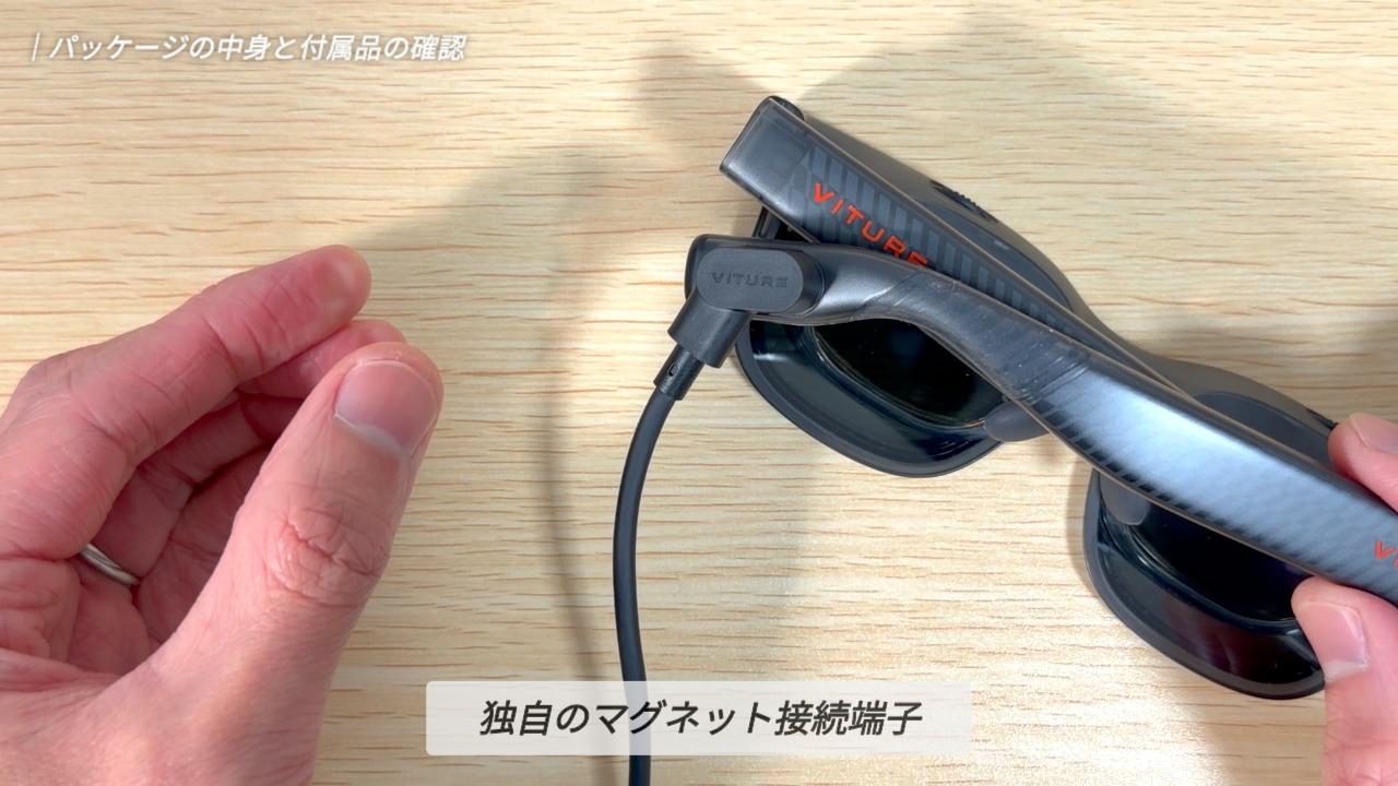 このケーブルは、グラスのテンプル部分にある端子に磁石でカチッと接続する独自仕様になっています。不意にケーブルを引っ掛けてもすぐに外れる設計のため、本体へのダメージや落下を防ぐ工夫がなされています。ケーブルの長さは約1メートルです。