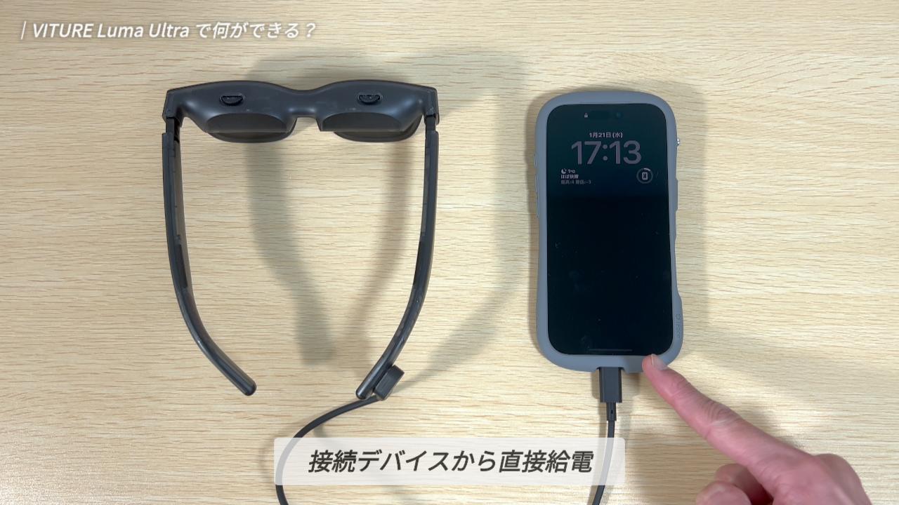 このスマートグラス自体にはバッテリーは搭載されておらず、電源は接続先のデバイスから供給される仕組みになっています。iPhone に接続した場合は、iPhone のバッテリーを消費しながら動くことになります。